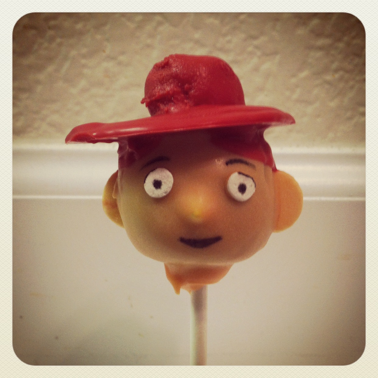 - Dip cake pop in peach candy. Before it dries, insert ears on each side. Position two eyes. Position hat. Let dry.